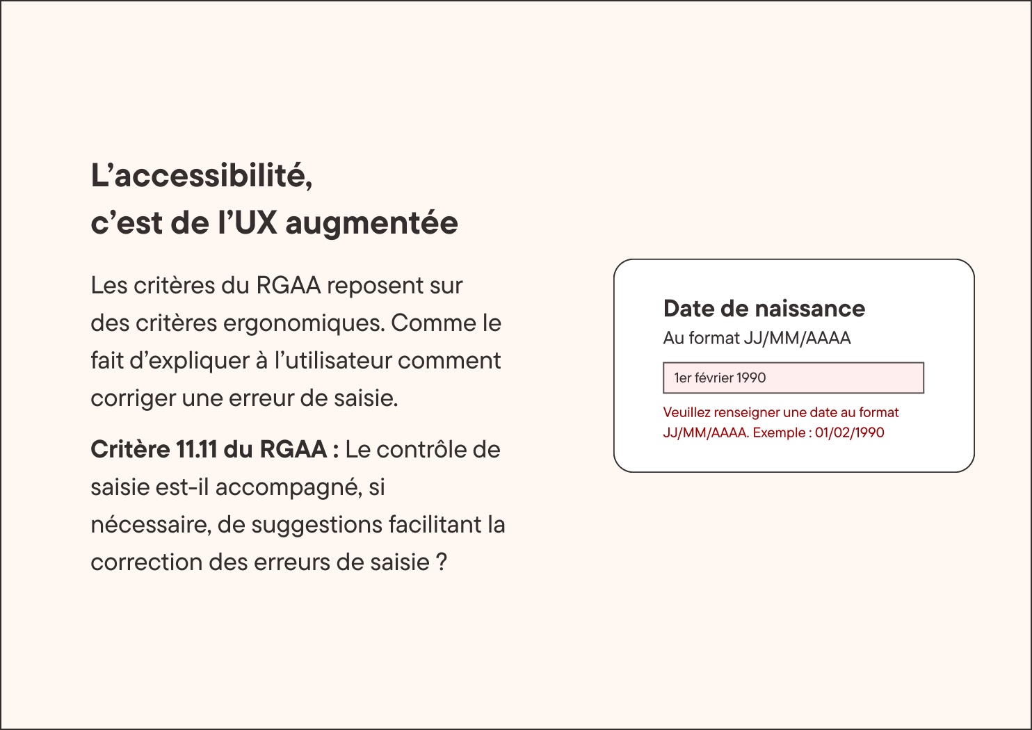 Exemple : Le critère 11.11 du RGAA indique qu’on doit expliquer à l’utilisateur comment corriger une erreur de saisie. Par exemple, si une date de naissance n'est pas remplie au bon format (1er février 1990 plutôt que 01/02/1990 alors le message d'erreur indique comment corriger l'erreur avec un exemple).